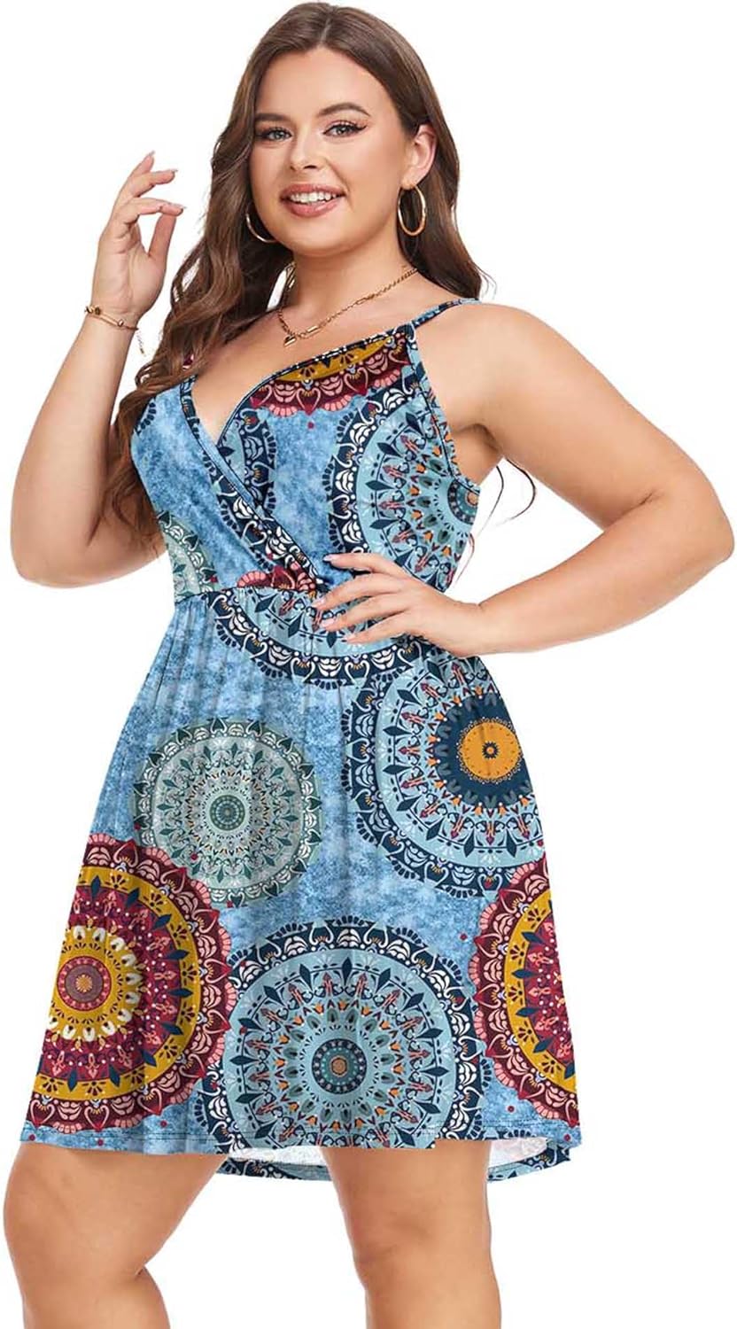 LALAGEN Plus Size Summer Dress for Women Spaghetti Strap Wrap V Neck Swing Beach Mini Sundress 1X-6X(Boho Blue)